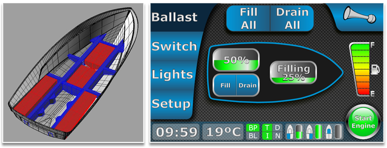 Além de controlados pelo sistema HMI®, os tanques possuem sensores digitais para visualização do nível de água, ou seja, é possível escolher e visualizar a quantidade de água em cada um dos tanques, de acordo com a sua necessidade. O sistema de lastros da FREERIDER Method, desenvolvido pelo setor de engenharia da FREERIDER Boats, é um sistema preciso, rápido e muito simples de utilizar. O sistema conta com bombas com capacidade de 40 litros por minuto cada, assim é possível esvaziar ou encher totalmente os tanques originais em menos de 5 minutos.
